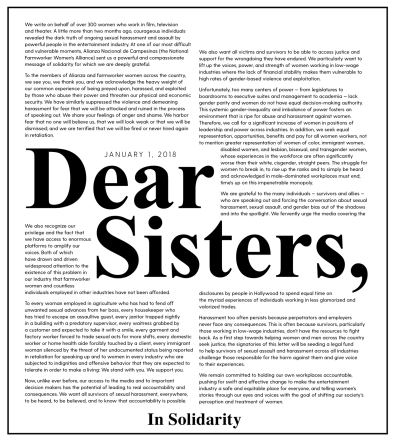 “TIME’S UP is a unified call for change from women in entertainment for women everywhere. From movie sets to farm fields to boardrooms alike, we envision nationwide leadership that reflects the world in which we live.”